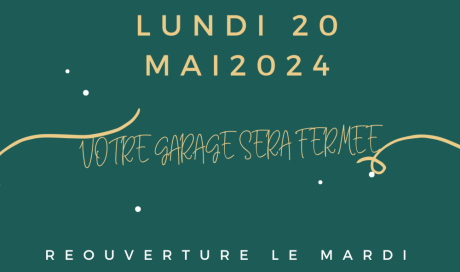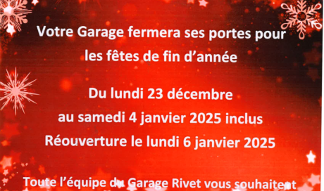 L'équipe du Garage Rivet vous souhaite une Joyeuse Pâques. Fermeture du garage le Lundi 1er Avril 2024, réouverture le Mardi 2 Avril 2024 à 8h00.