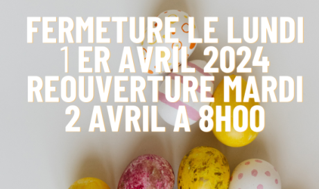 DU LUNDI 16 OCTOBRE 2024 AU MERCREDI 25 OCTOBRE 2024 : MODIFICATION DES HORAIRES LUNDI : 9H00-12H00 / 13H30-18H00 MARDI : 8H00-12H00 / 13H30-17H30 MERCREDI : 8H00-12H00 / 13H30-17H30 JEUDI : 8H00-12H00 / 13H30-17H30 VENDREDI : 8H00-12H00 /...
